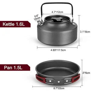 - Complete 22-piece set includes pot, pan, kettle, cups, dishes, and utensils for up to 4 people